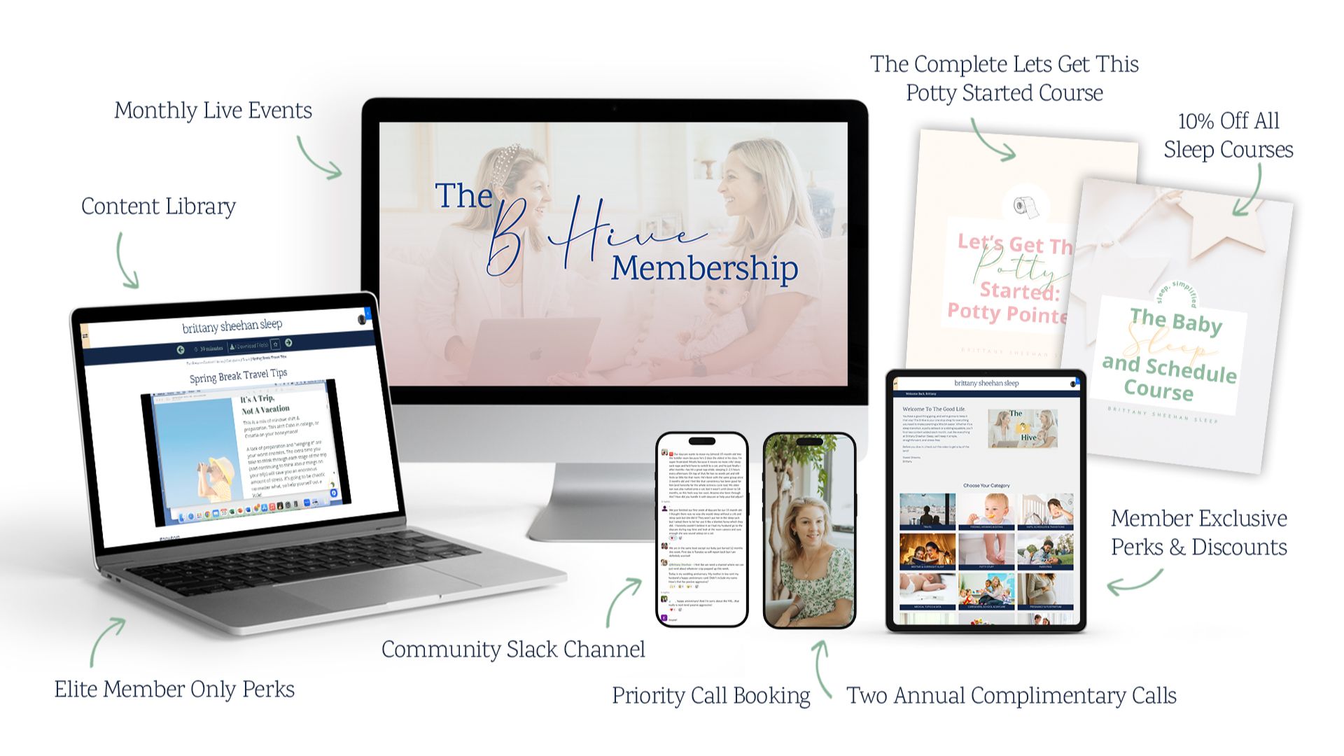 A private club of well-rested parents, jam-packed with fresh content on your most requested topics, live virtual events, connection with like-minded families, and access to one on one support with Brittany, to see you through each new stage of baby, toddler and big kid life.